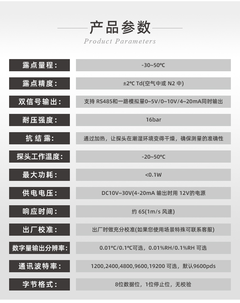 恒歌露點(diǎn)變送器采用瑞士 SENSIRION 進(jìn)口 SHT 系列溫濕度傳感器,可同時(shí)采集溫度及濕度數(shù)據(jù),具有精度高、功耗低、一致性好的特點(diǎn);采集到的溫濕度信號(hào)數(shù)據(jù),同時(shí)計(jì)算露點(diǎn)、濕球數(shù)據(jù),可通過(guò) RS485 接口輸出。11999