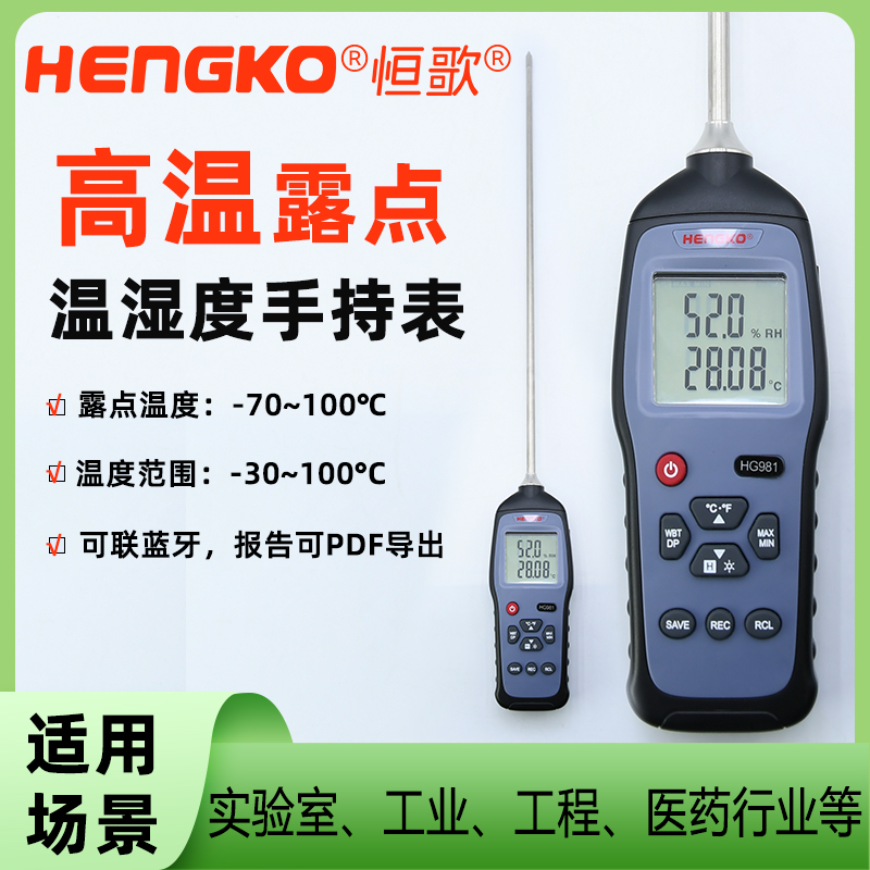 針對80~120℃高溫環(huán)境溫濕度和露點(diǎn)測試?yán)щy問題,研發(fā)的一款露點(diǎn)儀,范圍:-70~100℃的高溫手持表,同時測量溫濕度,露點(diǎn),濕球數(shù)據(jù),實(shí)現(xiàn)一機(jī)多用。搭配強(qiáng)大的軟件功能,連接軟件可實(shí)現(xiàn)數(shù)據(jù)處理與可視圖表分析,報告可以PDF導(dǎo)出,數(shù)據(jù)可以csv、excel文件可輸出。